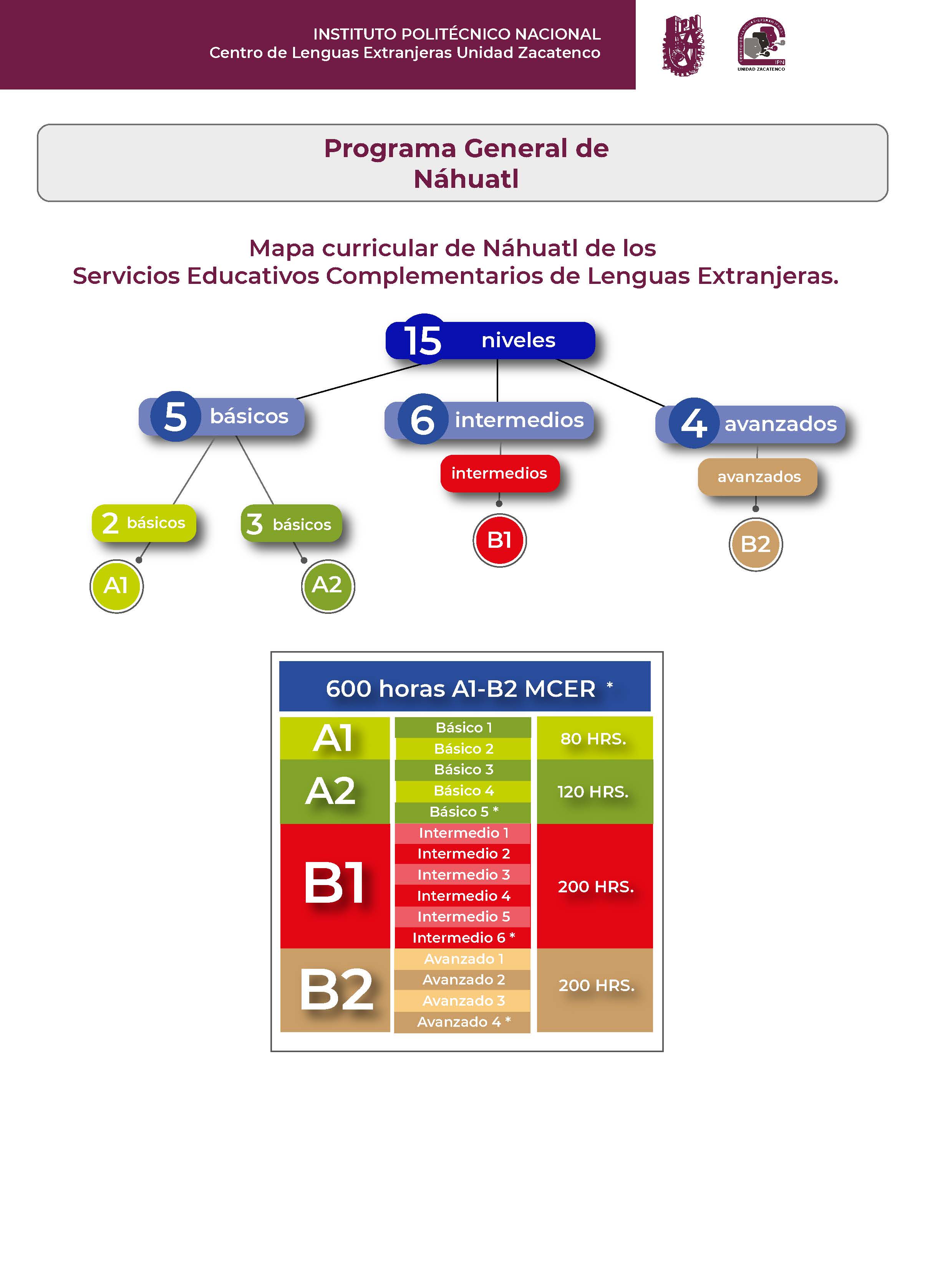 El Programa General de Náhuatl del CENLEX Zacatenco está conformado por 15 módulos. Cada módulo se imparte en 40 horas.