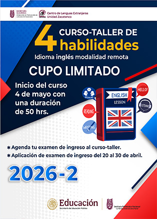 El Curso-taller de preparación para examen de 4 habilidades del CENLEX Zacatenco está dirigido a aspirantes con nivel B1 del MCER, usuarios inscritos a partir del módulo Intermedio 5 y estudiantes que desean fortalecer sus estrategias para acreditar el examen oficial que evalúa comprensión auditiva, lectura, expresión oral y escrita. Con una duración de 50 horas, el curso se divide en dos fases: la primera se enfoca en desarrollar estrategias para las habilidades receptivas (comprensión auditiva y lectura), y la segunda potencia las habilidades productivas (expresión oral y escrita), incluyendo aspectos socioculturales y de interacción comunicativa para asegurar una presentación exitosa del examen.