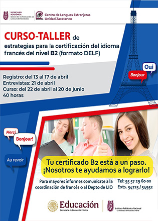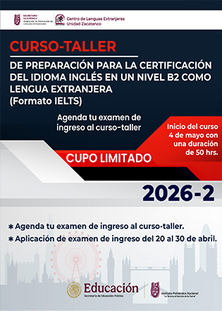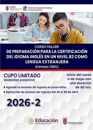 El Curso-taller de preparación para la certificación del inglés como lengua extranjera en un nivel B2 del MCER (Formato TOEFL) que ofrece el CENLEX Zacatenco del IPN está diseñado para fortalecer las habilidades lingüísticas necesarias para aprobar el examen TOEFL ITP, reconocido internacionalmente. Con una duración de 60 horas, este curso proporciona una preparación integral en comprensión auditiva, lectura y expresión escrita. Es ideal para quienes buscan certificar su nivel B2 para fines académicos o profesionales.
