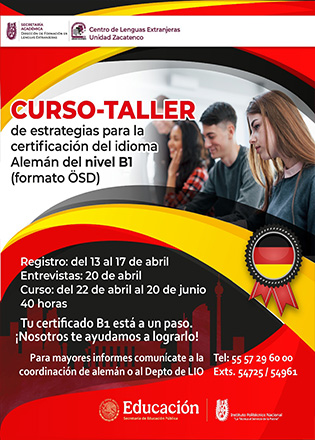 El candidato se prepara para lograr una presentación exitosa del examen de certificación ÖSD B1. Este proceso incluye la familiarización de los diferentes formatos propuestos para la evaluación de las habilidades lingüísticas, mediante el análisis de ejemplos, la realización de ejercicios específicos y la participación en actividades prácticas diseñadas conforme al modelo de las pruebas oficiales. En este sentido, se promueve la adquisición gradual y exhaustiva de estrategias esenciales, tales como la estructuración y organización de un discurso argumentativo, oral y escrito, el desarrollo de una comprensión auditiva y oral más selectiva. Para ello, se emplean materiales cuidadosamente seleccionados y orientados hacia dichos fines. El taller responde a la creciente demanda de estudiantes interesados en aprender alemán y obtener una certificación.