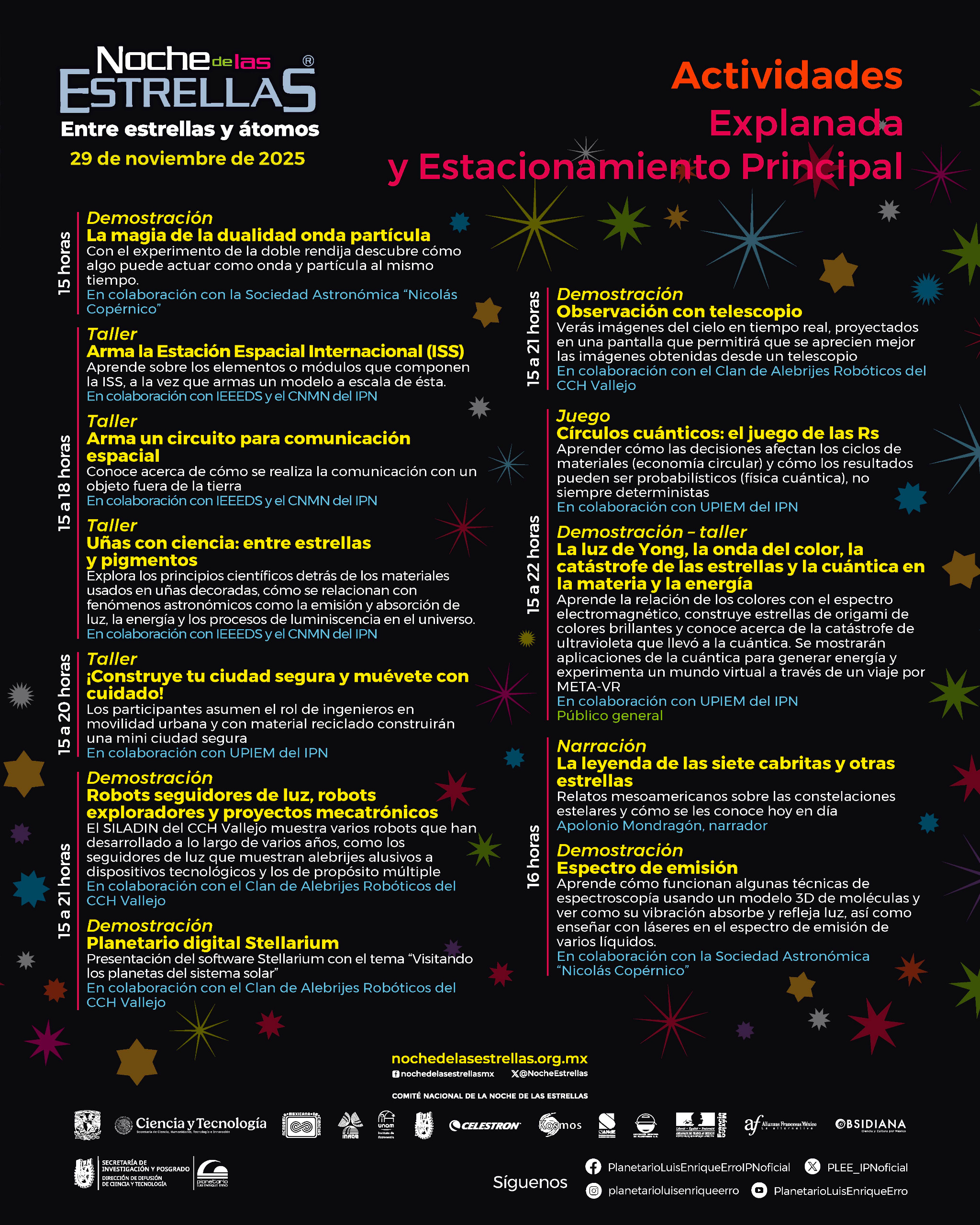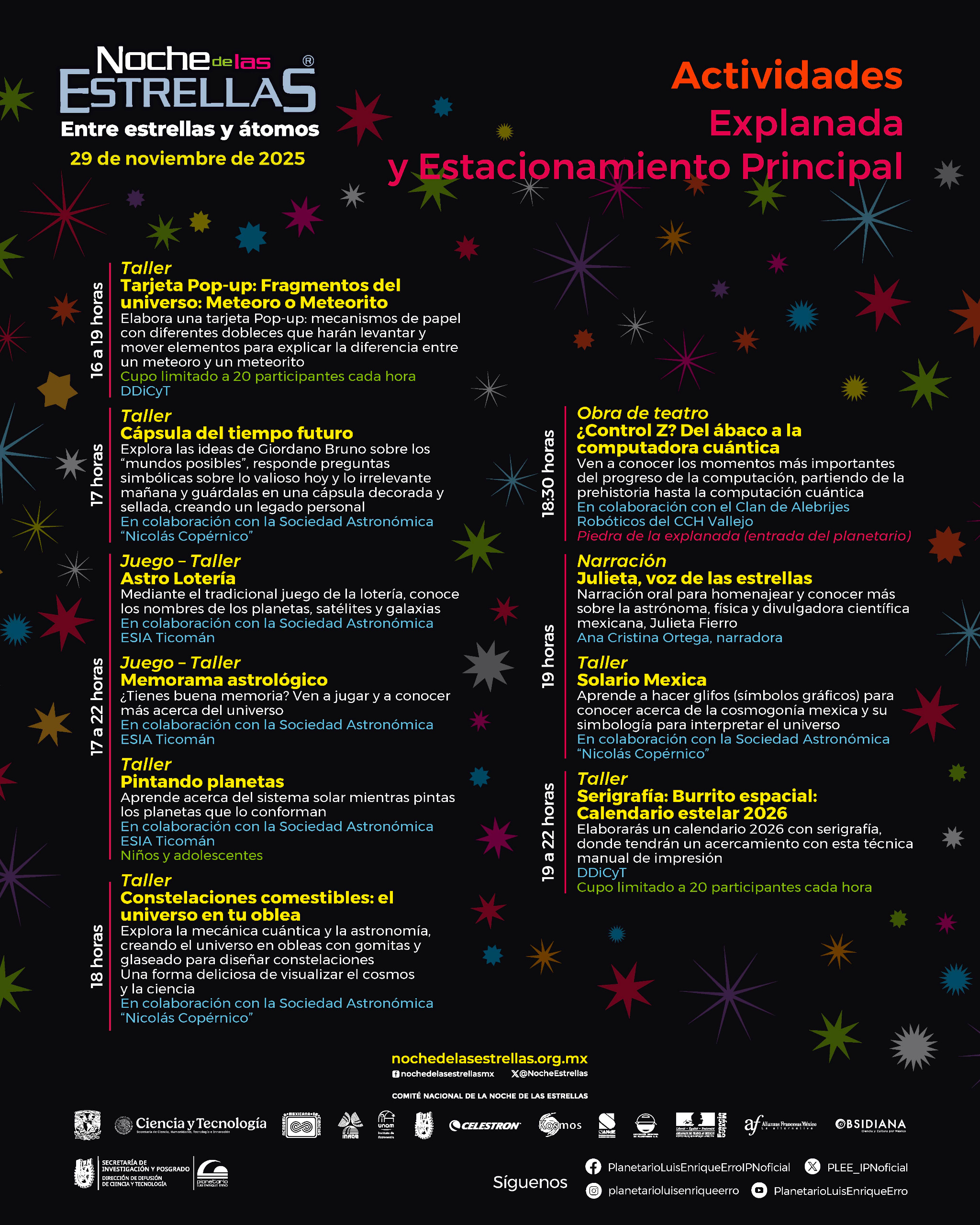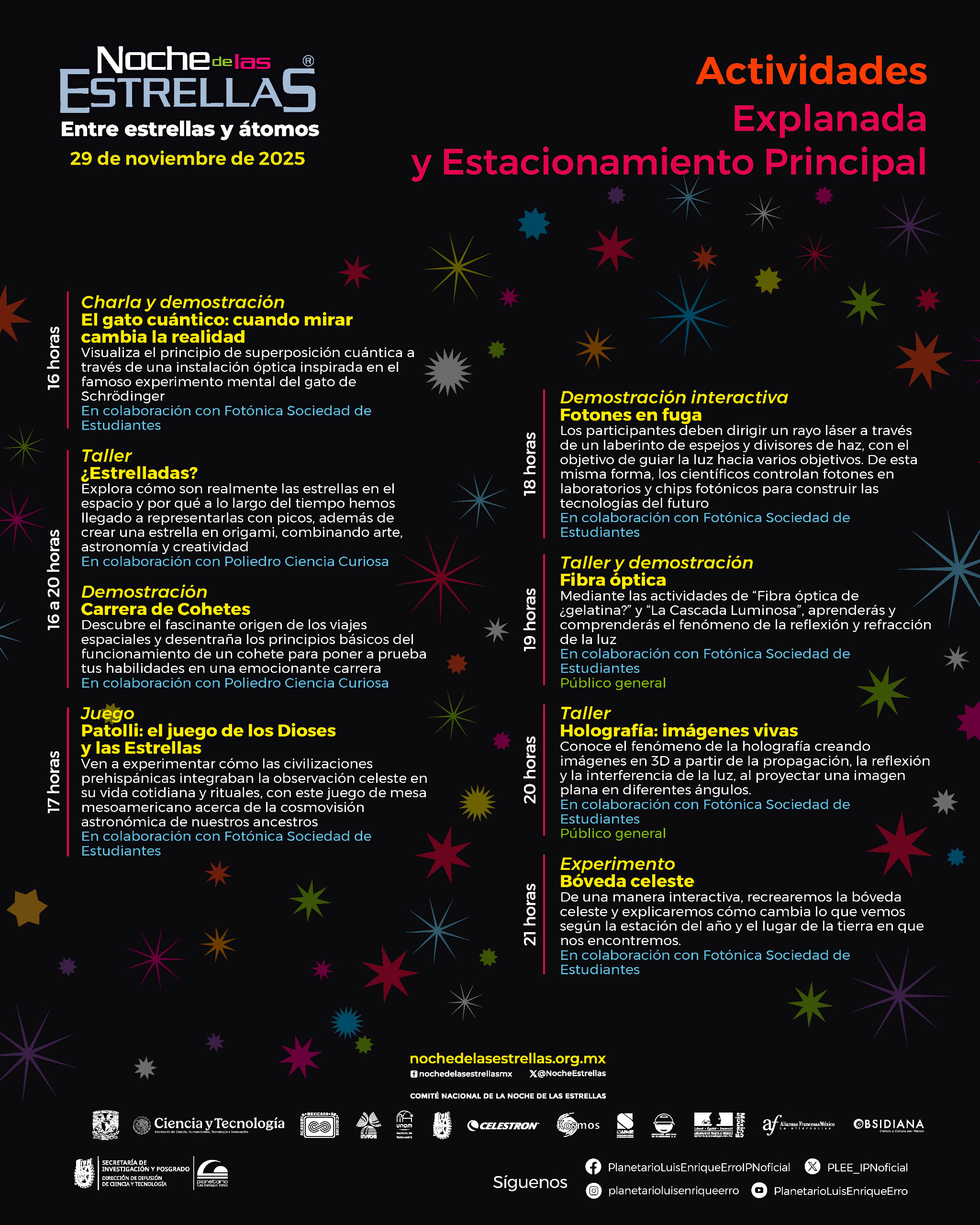 La Noche de las Estrellas es una celebración donde el cielo se convierte en nuestro gran salón de aprendizaje. Bajo la luz de la Luna y el brillo de los planetas, invitamos a familias, estudiantes y curiosos de todas las edades a descubrir los secretos del universo a través de telescopios, talleres y actividades llenas de magia científica. Es una noche para soñar, aprender y recordar que todos, donde sea que estemos, compartimos el mismo cielo.