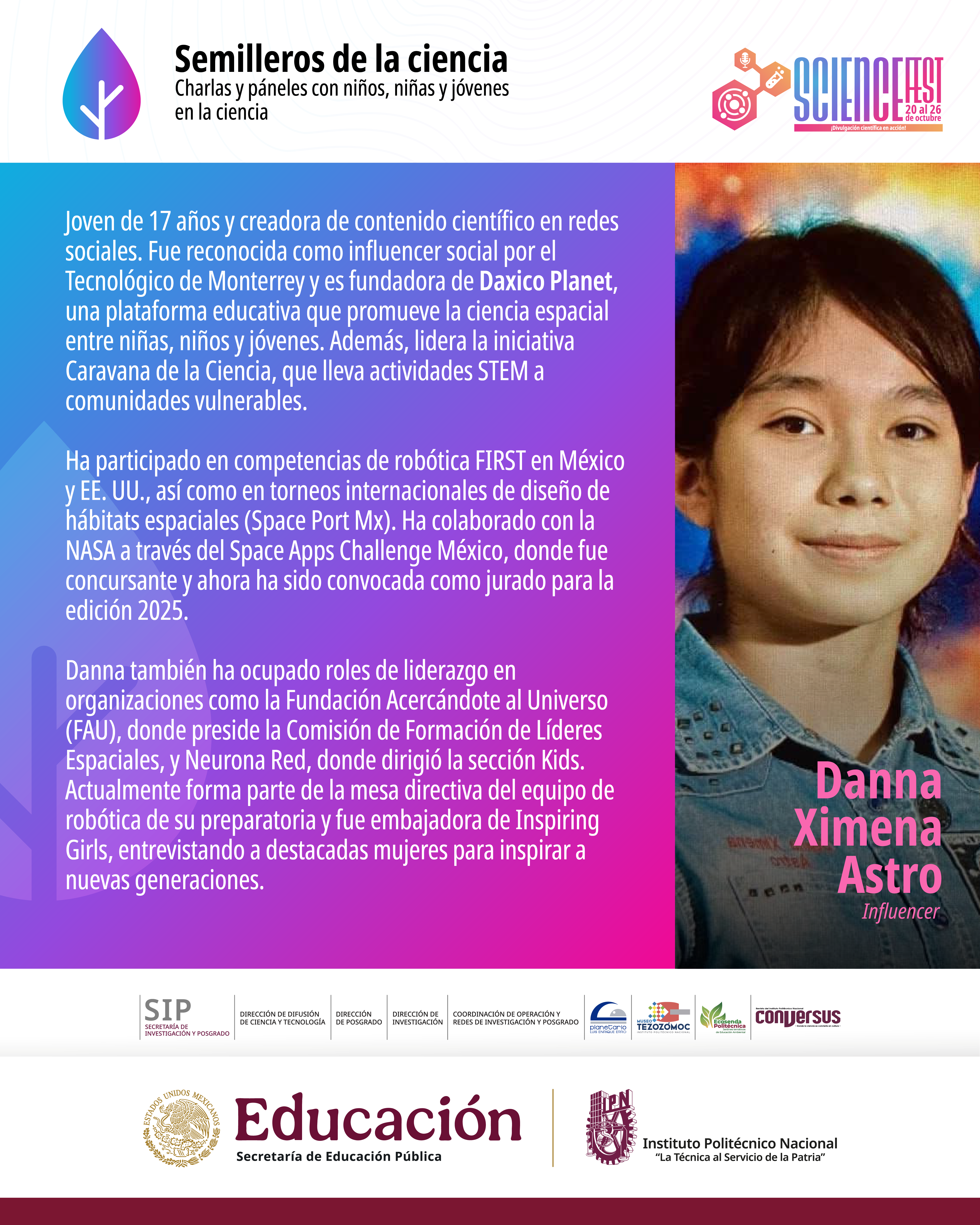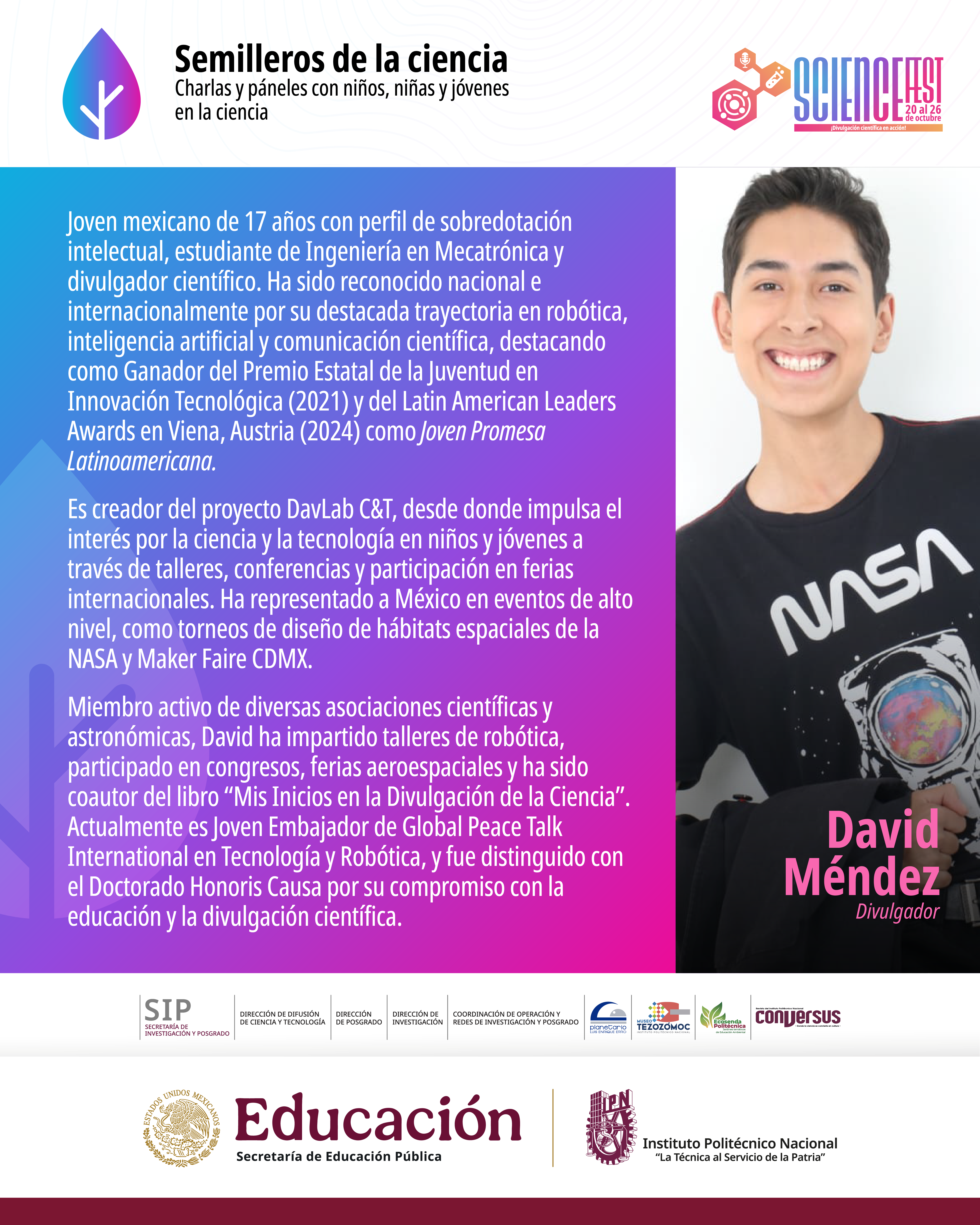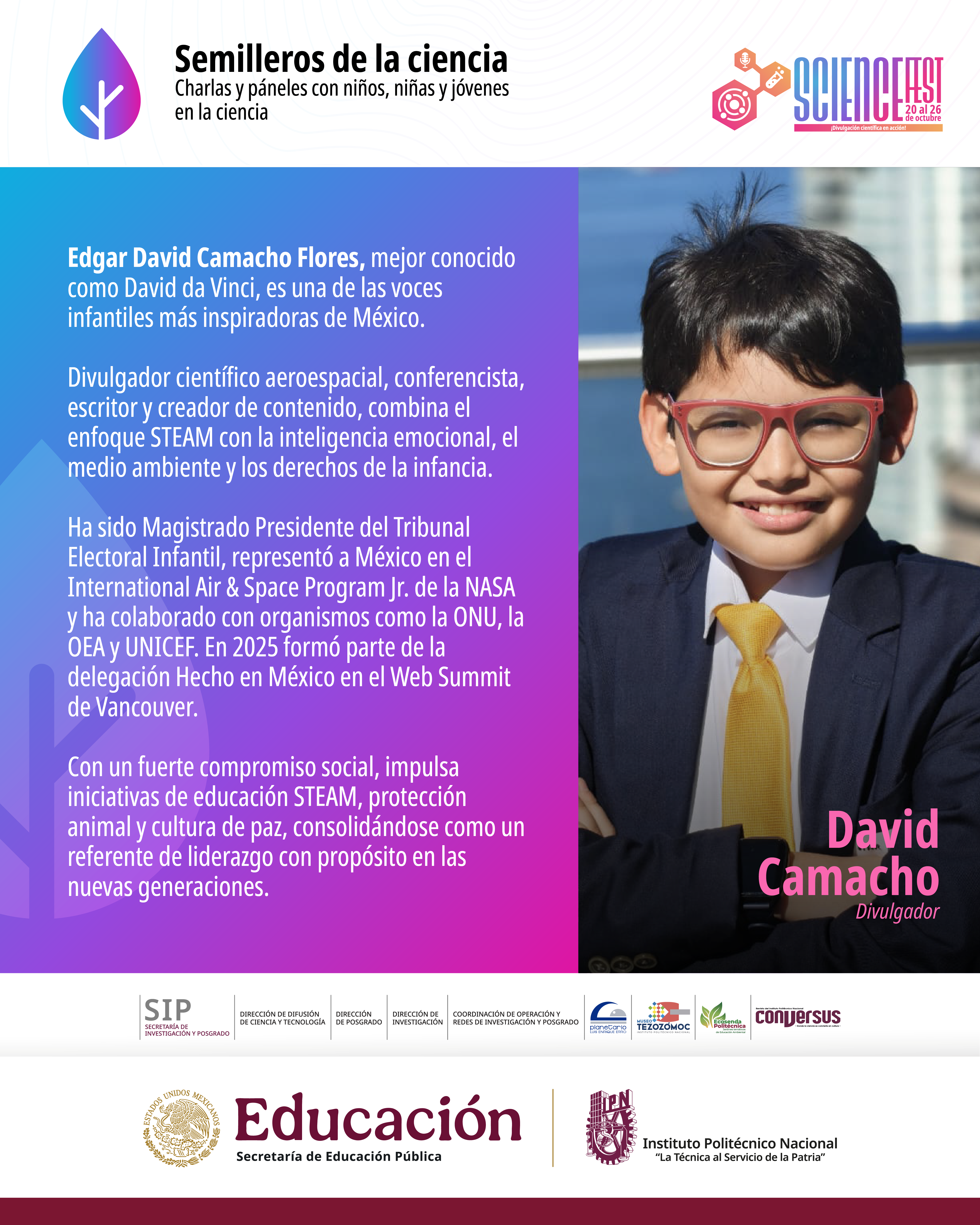 Paneles de divulgación protagonizados por niñas, niños y jóvenes que a su corta edad ya están realizando divulgación científica y son ya referentes nacionales e internacionales en diversos ámbitos de la ciencia y la tecnología.