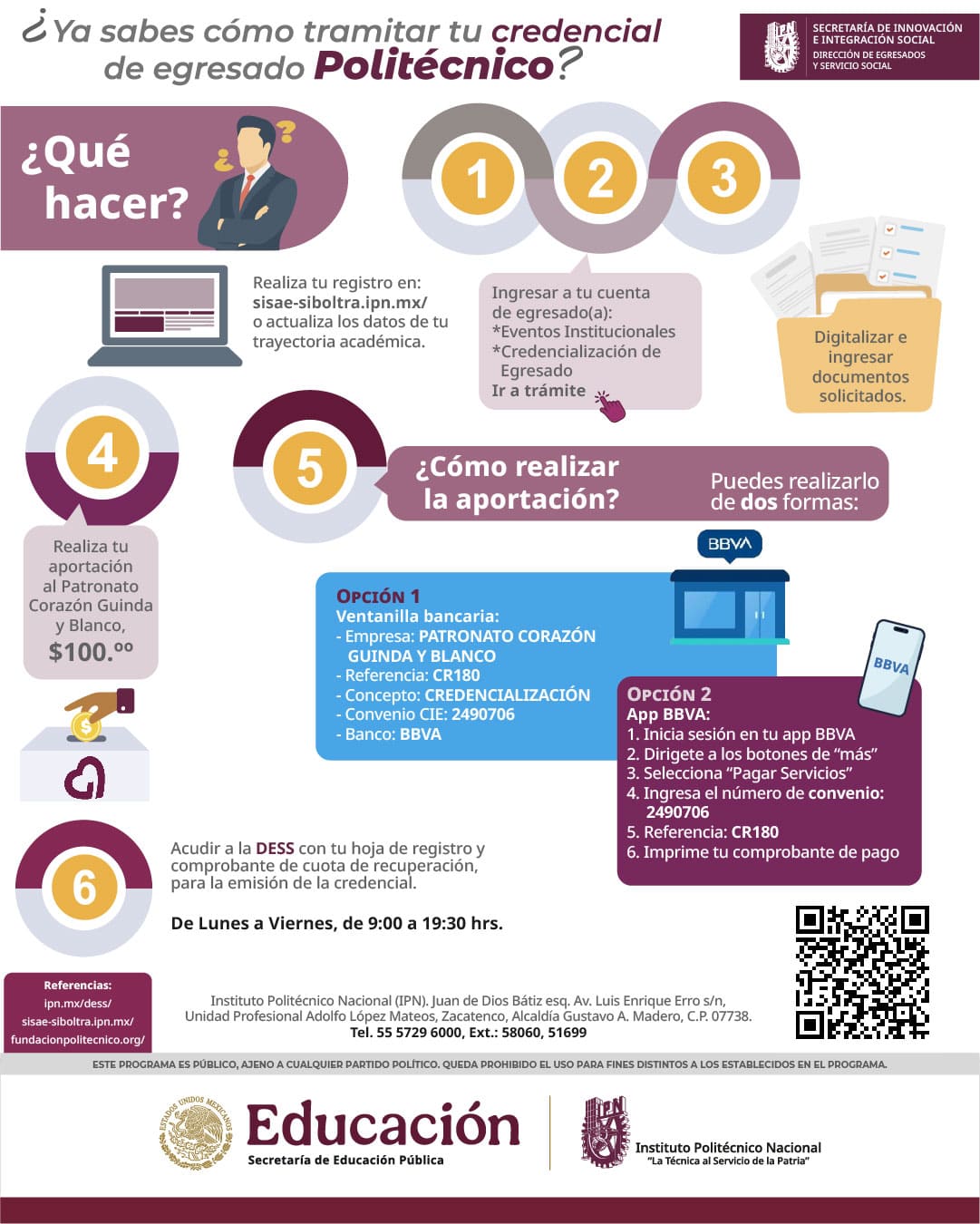 Para mayor información, comunícate al 57296000 ext. 58065 y 51636 o al correo dess@ipn.mx y egresados@ipn.mx