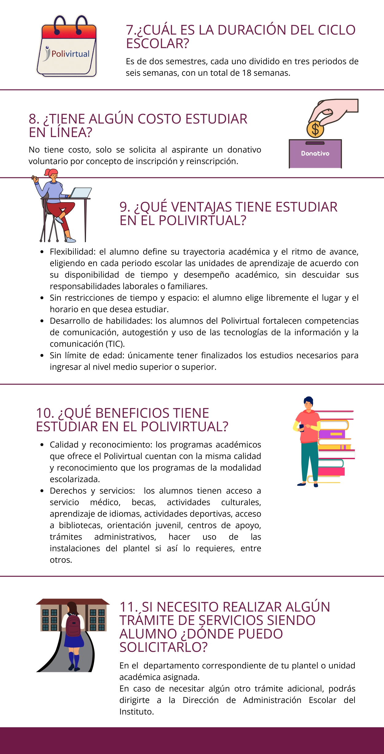 En estas modalidades, la licenciatura se cursa en un promedio de cuatro años y dependerá de tu desempeño académico, es decir, de que apruebes todas tus unidades de aprendizaje porque reprobar alguna hará que te retrases. Ten presente que, al inicio del cuarto año, tienes la opción de realizar tu servicio social y prácticas profesionales, así como elegir alguna opción de titulación para recibir tu título profesional, lo cual puede alargar el plazo mencionado.