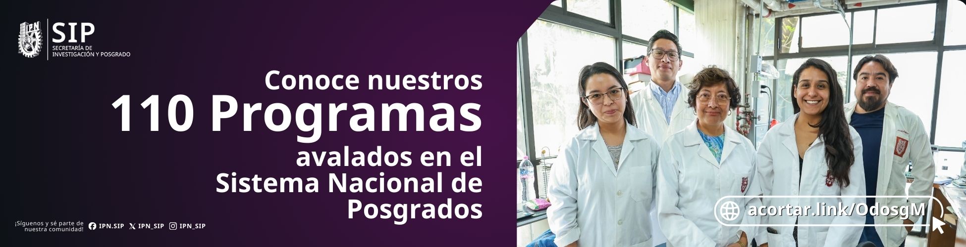 Bienvenidos al portal web de la Secretaría de Investigación y Posgrado (SIP) del IPN. En esta área nos encargamos de impulsar la generación, aplicación y transferencia del conocimiento científico y tecnológico. Además, promovemos y fortalecemos la formación de especialistas a nivel posgrado, contribuyendo al desarrollo social, científico y tecnológico en México y el mundo.
