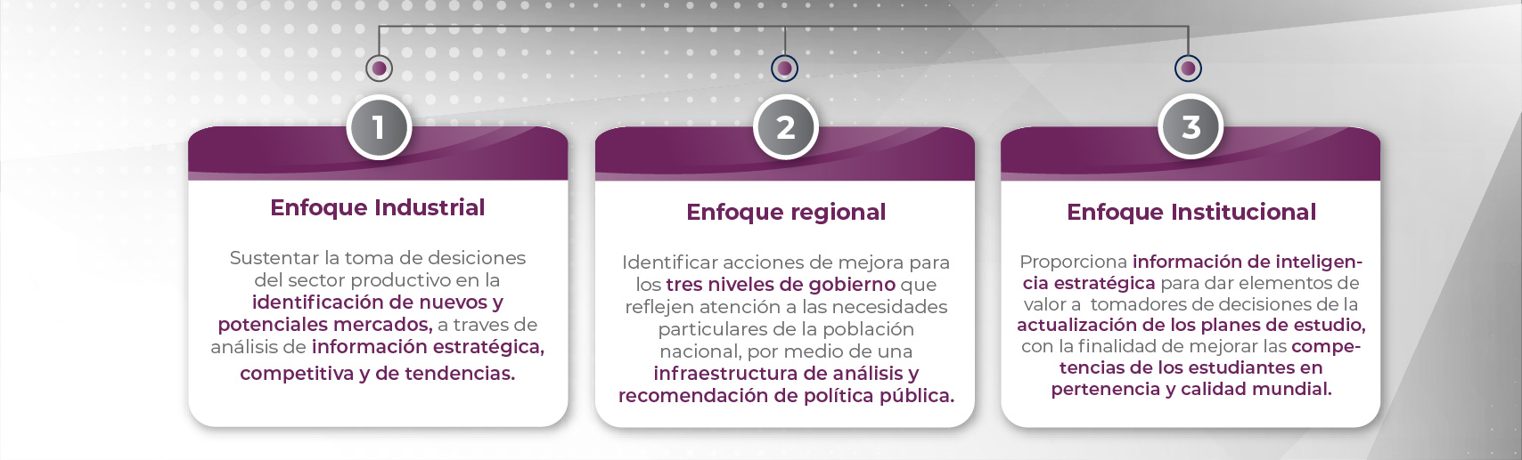 Los enfoques utilizados para la elaboración de dichos estudios, se encuentran vertidos en los Lineamientos Estratégicos para Estudios de Prospectiva, mismos, que bajo el enfoque de calidad y mejora continua son revisados de manera periódica por especialistas en el ramo propiciando su profesionalización.
